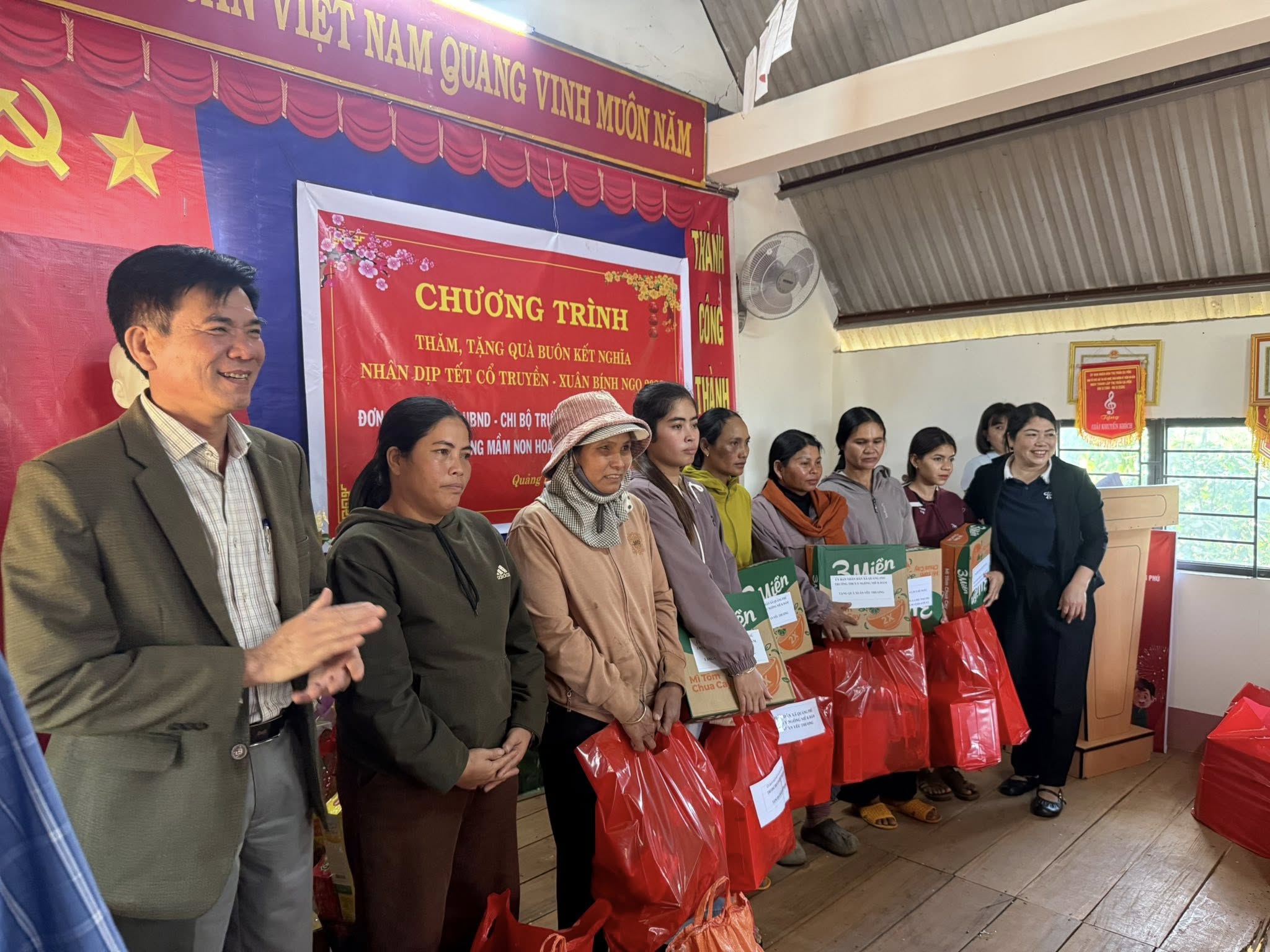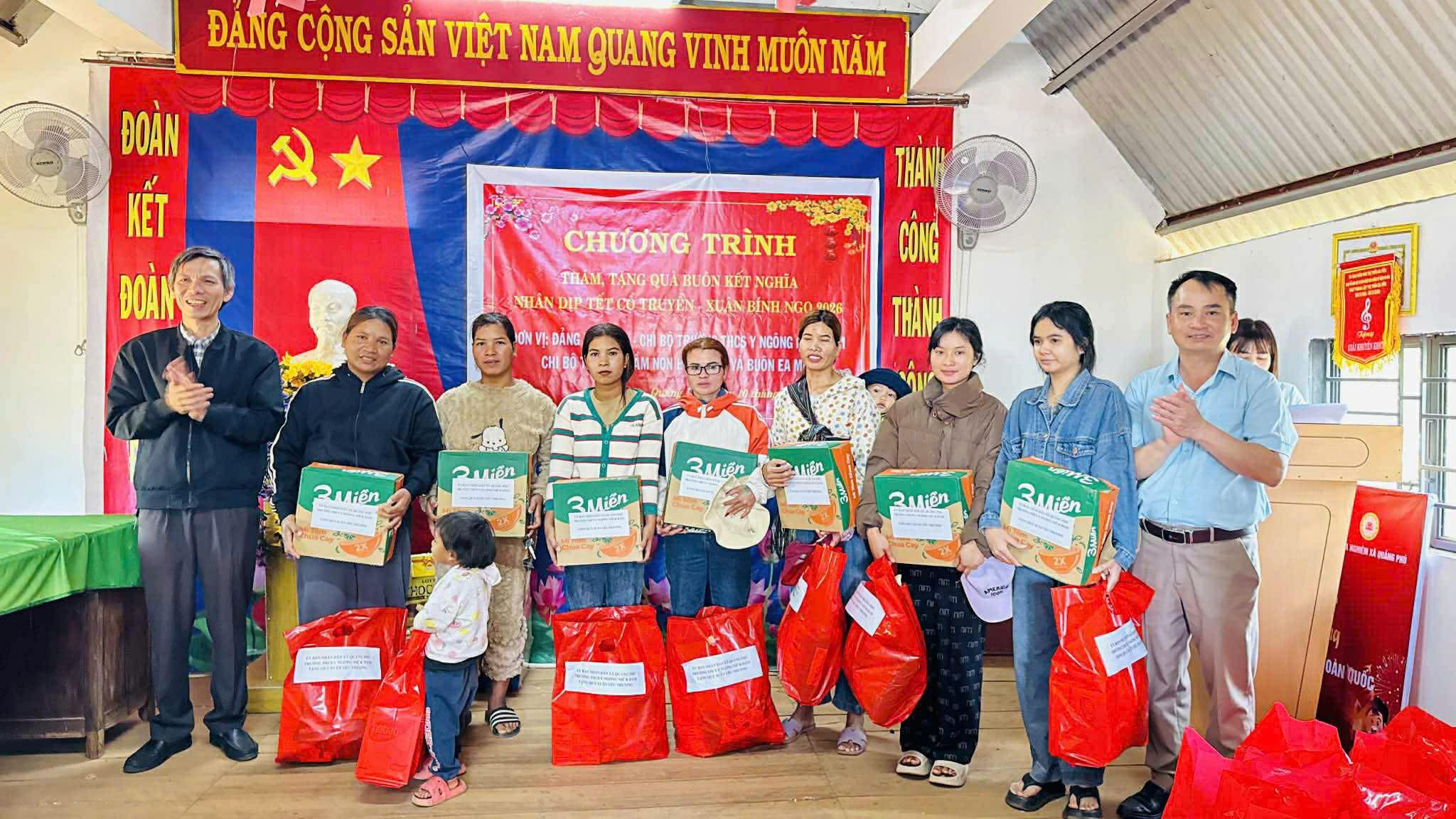 Nhân dịp Tết Nguyên đán Bính Ngọ 2026, sáng 10/2/2026, các đơn vị kết nghĩa gồm: Đảng bộ UBND xã Quảng Phú – Trường THCS Y Ngông Niê Kđăm – Trường Mầm non Hoa Hồng thăm tặng quà các hộ gia đình chính sách, già làng, hộ nghèo, hộ cận nghèo, trẻ em mồ côi, Cấp ủy Chi bộ, Ban công tác mặt trận buôn Ea Mấp. Tham dự có đồng chí Nguyễn Công Văn, Phó bí thư Đảng ủy, Chủ tịch UBND xã, Bí thư Đảng bộ UBND xã Quảng Phú; Đồng chí Nguyễn Tự Do, Phó chủ tịch UBND xã, Phó bí thư Đảng bộ UBND xã; các đồng chí là Bí thư, Phó bí thư Chi bộ Trường THCS Y Ngông Niê Kđăm – Trường Mầm non Hoa Hồng.